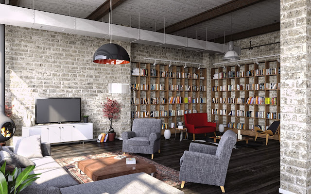 Bạn muốn có một phòng với giá sách? Nội thất công nghiệp này tránh những bức tranh cho các hình thức đầy màu sắc của sách, mà dòng hai bên của hai bức tường gạch. Một phòng khách màu xám và bàn thấp xuống thêm cuộc trò chuyện, trong khi mặt dây chuyền vòm đuôi cam-dốc và lửa hỏa hoạn mang lại sự ấm áp. Các yếu tố màu đỏ trong ghế đọc da lộn và hoa anh đào pha trộn trong màu sắc.